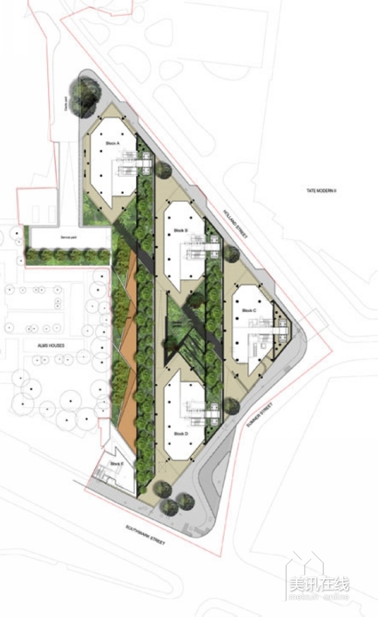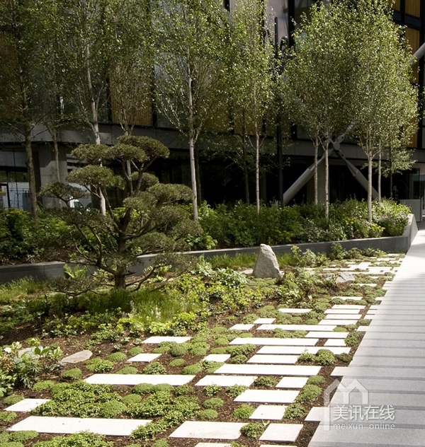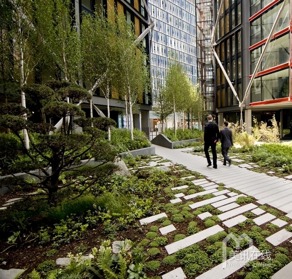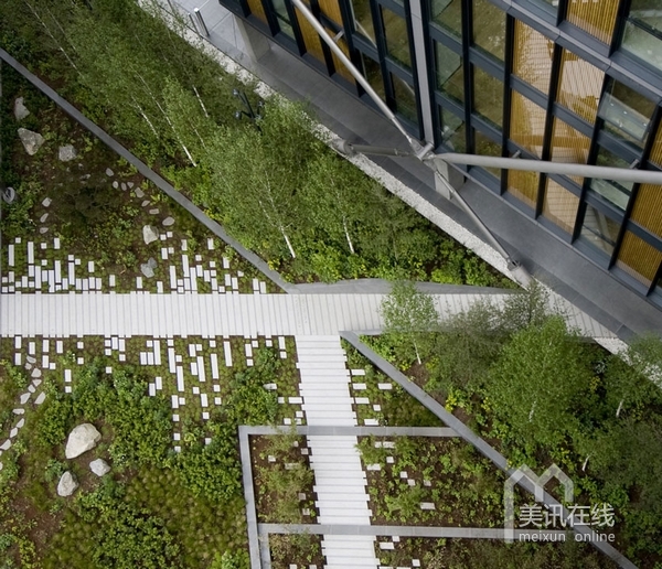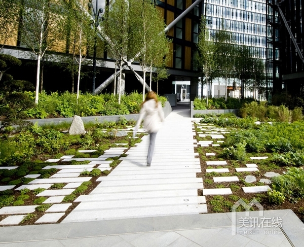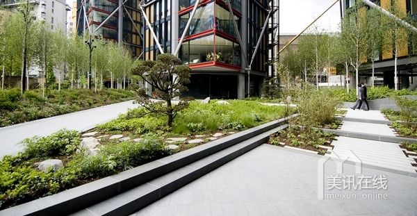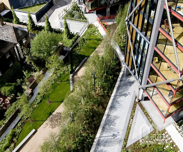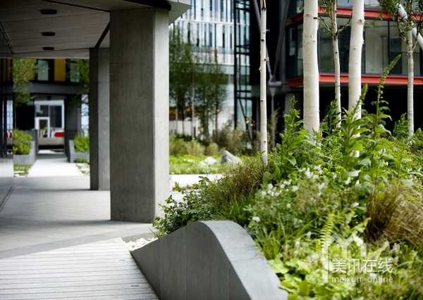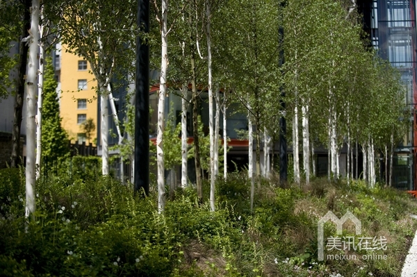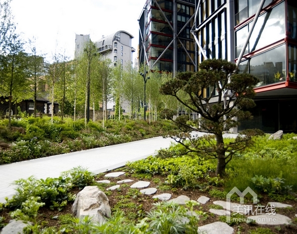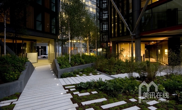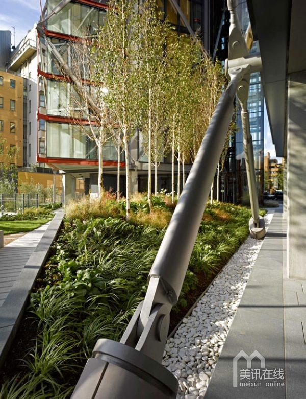 在住宅區(qū)內(nèi),沿著由RSHP設(shè)計的住宅樓,設(shè)計了一系列的花園景觀。受本土林地影響,整個的庭院設(shè)計線條清晰,呈現(xiàn)出柔軟