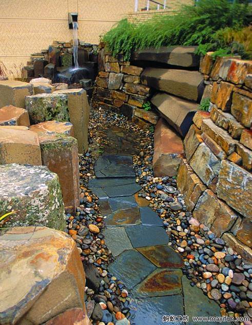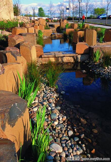 你也許會問,藝術(shù)在哪里?雨水打造的水體景觀的建筑表達方式是什么?優(yōu)秀的設(shè)計能否將雨水利用和運用雨水本身所形成的融合建筑體驗的“場所創(chuàng)造”聯(lián)系在一起?答案是肯定的。一些富有創(chuàng)造力的景觀設(shè)計師已經(jīng)發(fā)現(xiàn)雨水所蘊含的藝術(shù)潛能。就像我上面說的一樣,關(guān)鍵是表達出雨水在整個設(shè)計中的獨特動感之美。景觀設(shè)計師史蒂夫·科赫為波特蘭的一座公寓設(shè)計的庭院景觀就是一個典范??坪盏脑O(shè)計將屋頂雨水收集起來,水流在高低錯落的水道中歡快地跳躍著,最后注入巖石圍筑的水池。水池下是一個用于收集雨水的蓄水池。值得注意的是科赫的這個成功作品還借鑒了印度傳統(tǒng)的建筑圖騰。景觀設(shè)計師在利用雨水打造水體景觀時,要充分學(xué)習(xí)當(dāng)?shù)貍鹘y(tǒng)文化,將其有效地運用到設(shè)計中。
