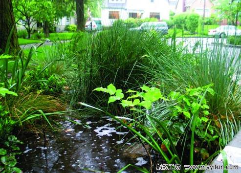 一項日益盛行的利用雨水打造水體景觀的重要創(chuàng)新之舉就是采用“綠色街道”。所謂“綠色街道”就是通過入滲池、雨水花園以及街道與人行道之間常有的淺溝來收集雨水。就像本文所提到的其他景觀設(shè)施一樣,“綠色街道”同樣也有效地減輕了市政排水系統(tǒng)的壓力。波特蘭已將這種功能性的“綠色街道”作為城市正在實施的示范項目。一般來說,“綠色街道”設(shè)在現(xiàn)有城市肌理的隱蔽處或縫隙處,如學(xué)校周圍、停車場、林蔭大道、雜貨店入口或住宅區(qū)的停車位。它們仿佛是現(xiàn)代城市中冰冷堅硬的街道及停車場中的“星星之火”,為城市搭建起一條處理城市雨水的生態(tài)體系。在典型的“綠色街道”中,雨水在排水溝中流經(jīng)整條街道,最后注入一系列種有植被的洼地,雨水在這里經(jīng)植物凈化滲入土壤。降水量大的時候,多余的雨水則排入傳統(tǒng)的城市排水系統(tǒng)中。