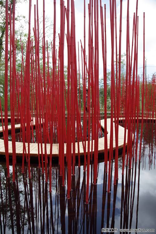 曲線形的木棧道對(duì)角穿越方形水池,漂浮于水面。小棧道僅50厘米寬,容一人穿行。它是“圓”的符號(hào),也是體驗(yàn)水池?zé)o限風(fēng)光的路徑。水池中間是三叢紅色竹竿,它們可取之四周竹林的老桿,是可再生的材料。垂直的竹竿叢沿木棧道分布,令行走在棧道上的游客體驗(yàn)穿越的快感。垂直的竹叢倒影水中,與變換的天景相輝映,創(chuàng)造出寧靜和深遠(yuǎn)的氛圍。雖然水深只有30厘米,卻通過垂直向天的紅色竹竿,創(chuàng)造出無限深遠(yuǎn)的感覺。方圓周邊和水中植物全部為中國(guó)植物,渲染出濃郁的中國(guó)氣氛。
