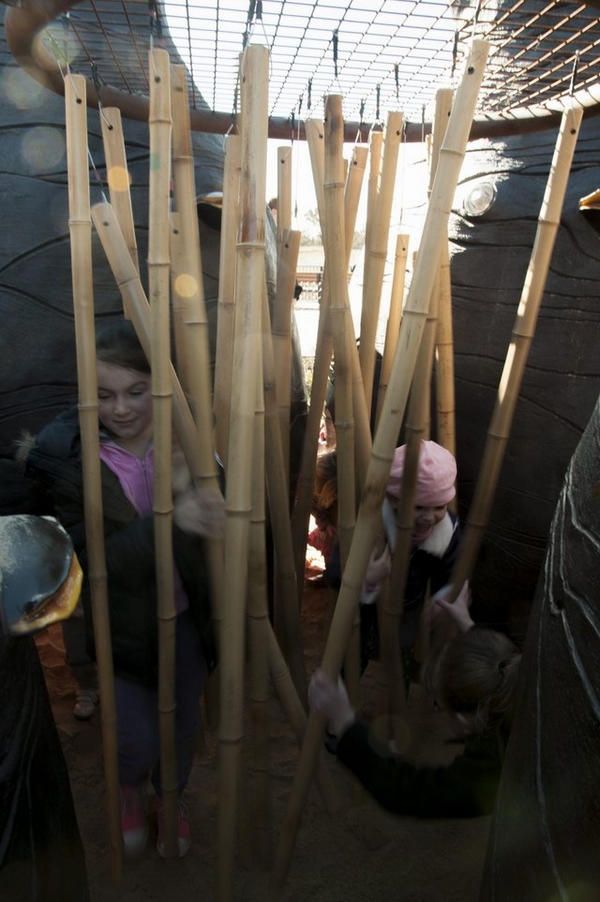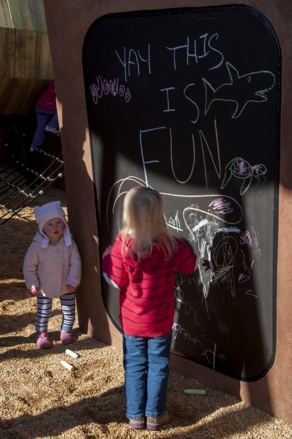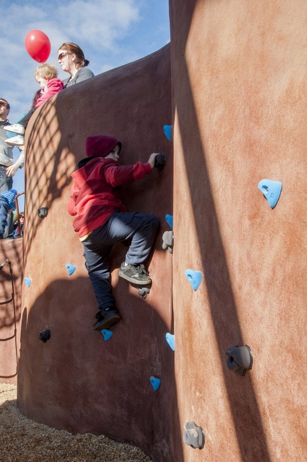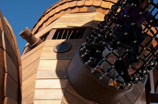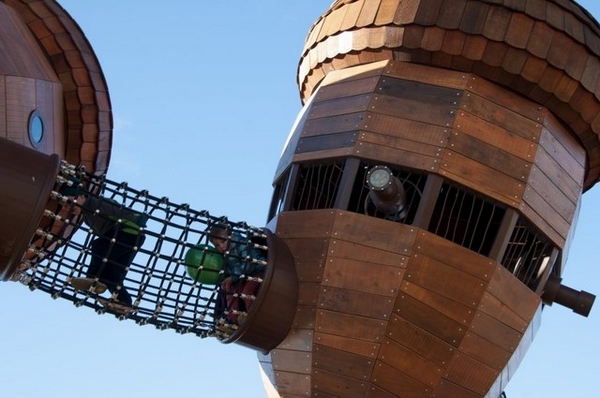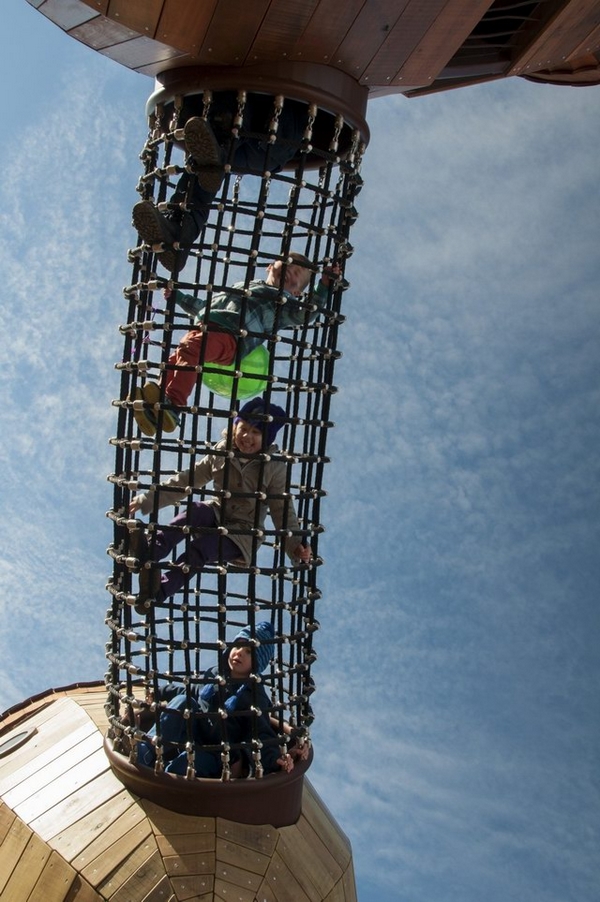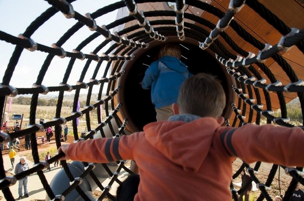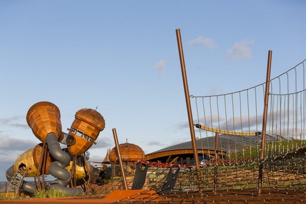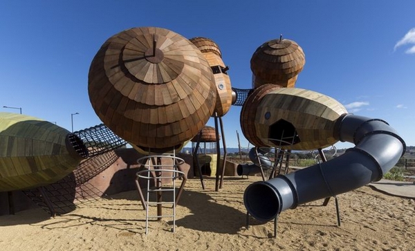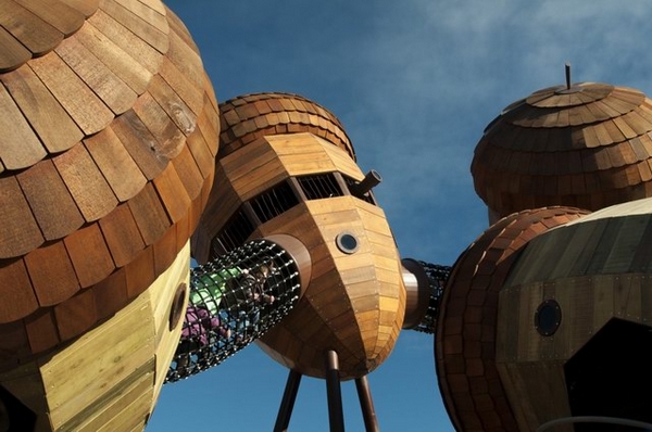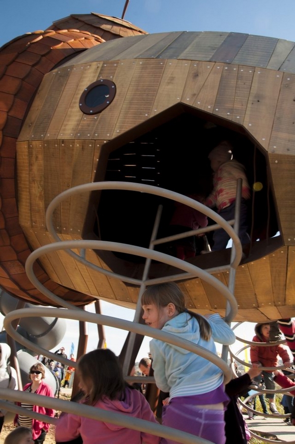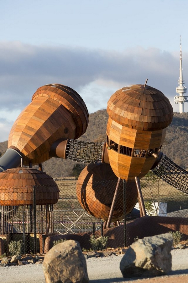 設計師將游樂場設計成了一個小型的主題公園,主題當然是圍繞著植物進行。你可以看到巨大的橡子小屋被掛在天空,“橡子”之間有管道連接,孩子們可以從這顆“橡子”爬進那顆“橡子”。還有巨大的山龍眼(Banksia,澳洲著名的代表性植物之一)圓錐體坐落在森林地表。