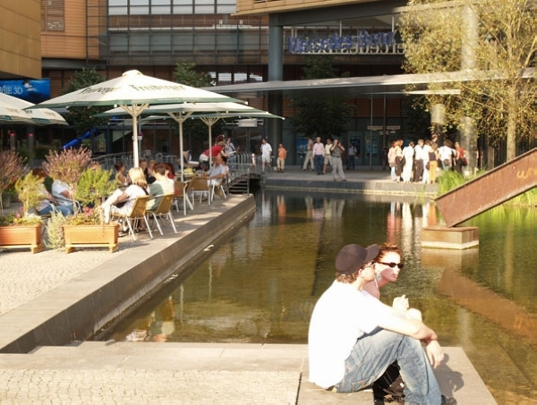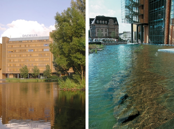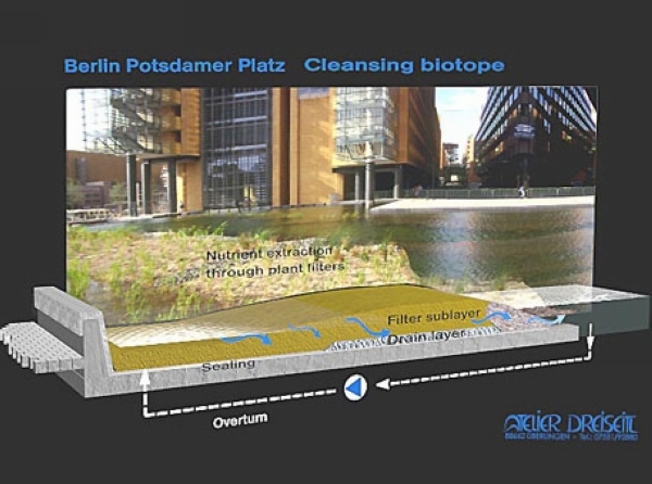 這一城市水景設(shè)計(jì)之中蘊(yùn)含的理念即為,雨水在降落之地即應(yīng)被就地使用。在波茨坦廣場(chǎng),綠化屋頂和非綠化屋頂?shù)慕Y(jié)合設(shè)計(jì)可以獲取全年降雨量。雨水從建筑屋頂流下,作為沖廁、灌溉和消防用水。過量的雨水則可以流入戶外水景的水池和水渠之中,為城市生活增色添彩。