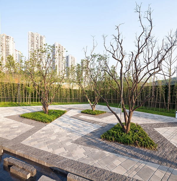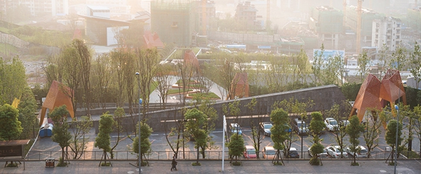 綿延的山峰、四川盆地的山谷、水稻梯田、蜿蜒的長江和重慶灰白薄霧彌漫的神秘天際在公園周圍形成了巨幅的自然背景,建立了強(qiáng)烈的視覺聯(lián)系。