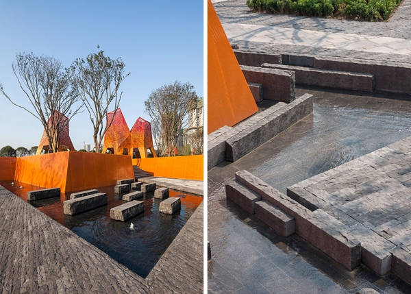 休憩、賞景的平臺?!癦”形小道兩旁是用大塊黑色深紋理混凝土制成的護(hù)墻,游人仰望山丘,會看到一道長長的巖石輪廓。護(hù)墻圍成的溝谷或溝壑形成了流經(jīng)公園的溪流。