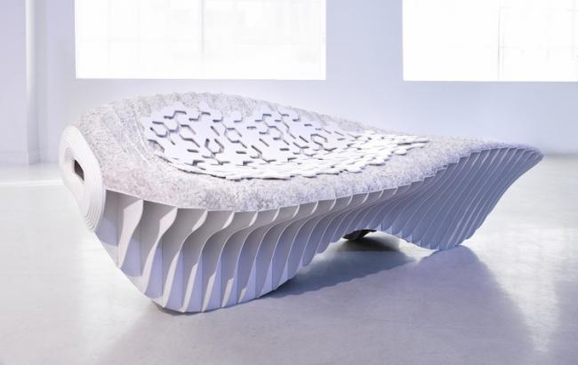 是否想過你的家具是由堆肥組層的?這個問題的提出伴隨著一系列有關生物制造長椅的研究。 Terreform ONE和Genspace公司聯(lián)手開發(fā)了兩張生物塑料椅。生成的兩把椅子采用了類似的過程:一把由白色肋骨構成的參數(shù)化外形的躺椅,椅子上加了柔軟的墊子。另一把是兒童椅,它將分段的各部分內部連接起來,這樣的方式可以讓使用者根據(jù)需要改變其形狀。