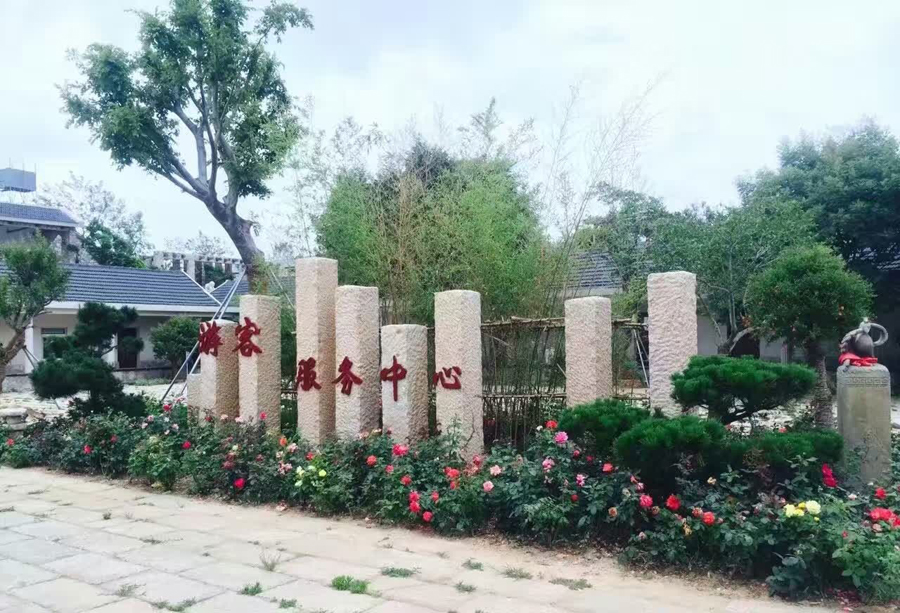 從主園路看游客中心南廣場,主園路兩側(cè)栽植的造型日本羅漢松,增加迎賓同時也表達徐福東渡日本的歷史文化。北側(cè)有徐福像。