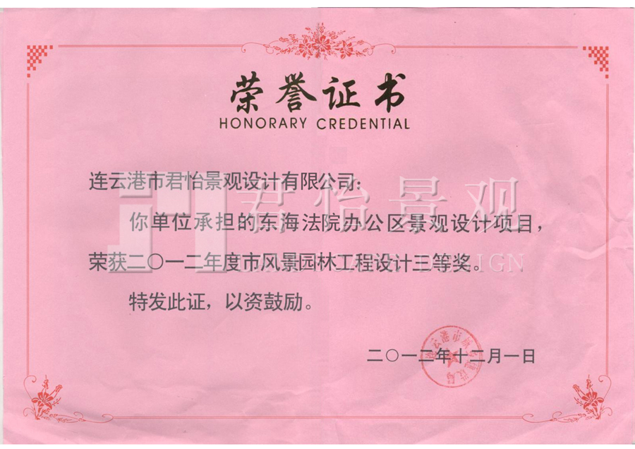 2012年獲獎證書