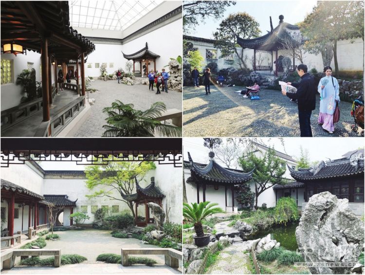 這張拼版照片展示的是:左上,2017年4月21日拍攝的美國紐約大都會(huì)博物館內(nèi)的“明軒” ;右上,2019年4月1日拍攝的“明軒”原型,中國蘇州網(wǎng)師園內(nèi)的殿春簃;左下,2019年4月3日拍攝的中國蘇州東園內(nèi)的“明軒”實(shí)樣;右下,2019年4月3日拍攝的中國蘇州南園內(nèi)的“明軒”?!懊鬈帯痹谌蚍秶鷥?nèi)共有這四個(gè)版本。